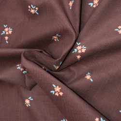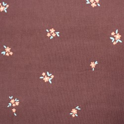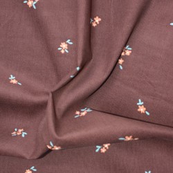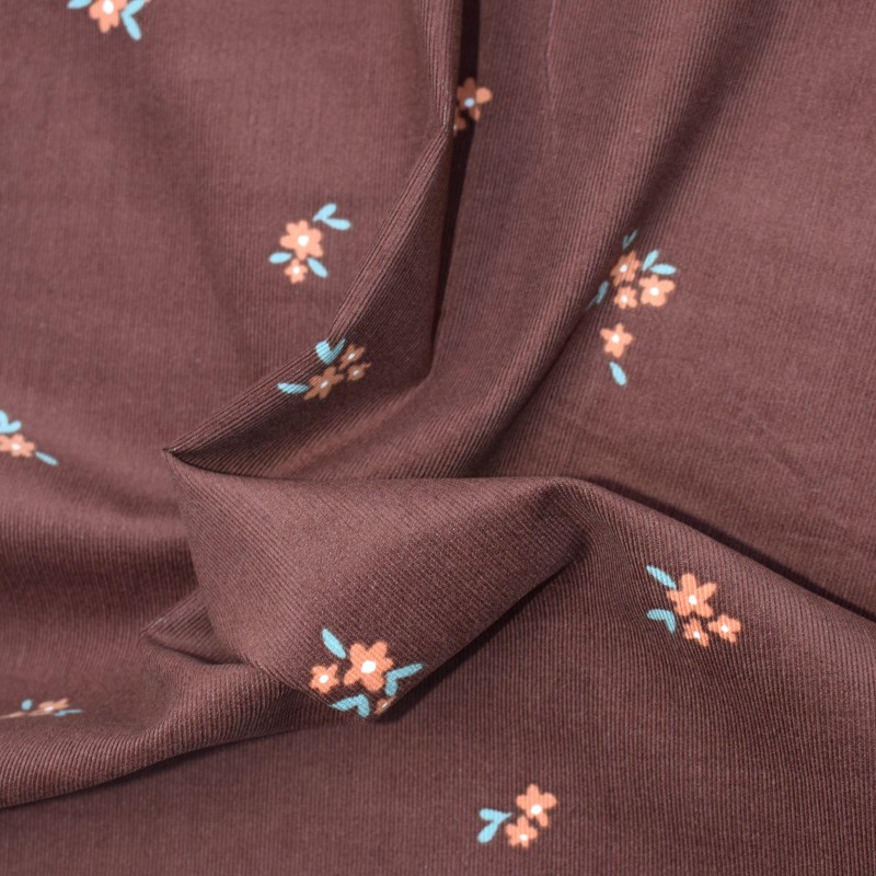 Tissu velours milleraies imprimé à petites fleurs corail avec feuilles vertes sur fond marron. Ce tissu velours milleraies d'une très belle qualité et Oeko-tex sera parfait pour la réalisation de vêtements pour enfants, bloomers, jupes, robes..