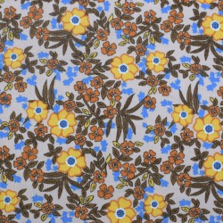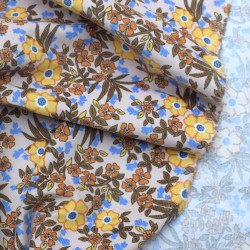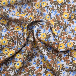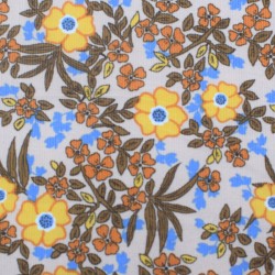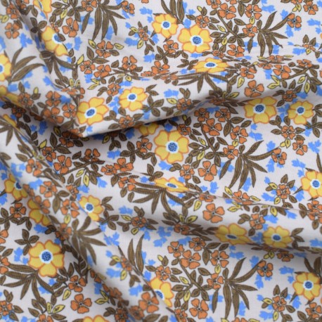 Tissu velours milleraies Babycord imprimé à petites fleurs jaunes. Ce tissu velours milleraies d'une très belle qualité et Oeko-tex sera parfait pour la réalisation de vêtements, bloomers, jupes, robes, tops…