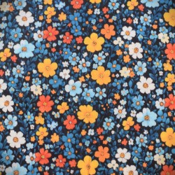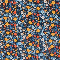 Tissu Batiste Fleuri 100% Coton – Fond noir, fleurs orange & moutarde