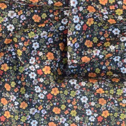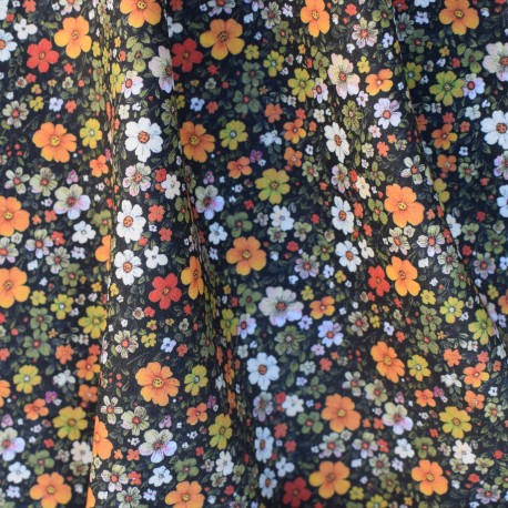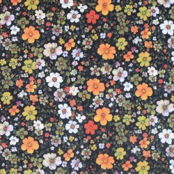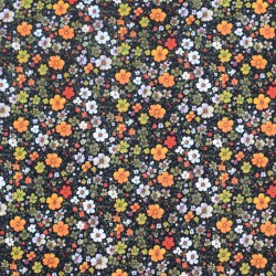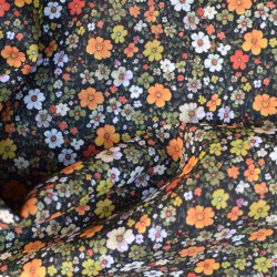 Tissu Batiste Fleuri 100% Coton – Fond noir, fleurs orange & blanches