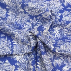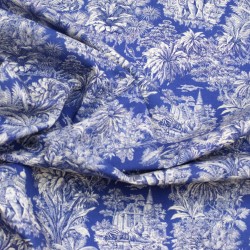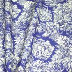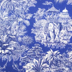 Notre cotonnade imprimée façon toile de Jouy revisite l’élégance des indiennes avec une scène riche et immersive. Éléphants majestueux, tigres et maharadjas évoluent dans une végétation luxuriante, évoquant un voyage textile au cœur d’un univers précieux et dépaysant.