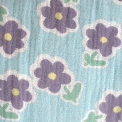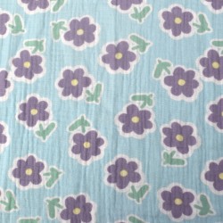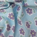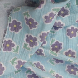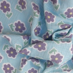 Tissu double gaze de coton à fleurs Violettes fond bleu ciel